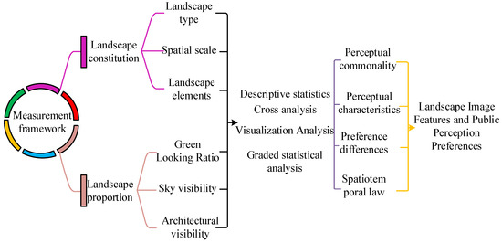 In Equation (7), denotes the sky visibility and denotes the area of the sky in the picture. Through the classification and content recognition of image data (semantic image segmentation), the relevant landscape feature information in a picture is mined, and based on it, the two dimensions of landscape imagery are proposed, namely the landscape composition and the landscape proportion and color. The landscape composition can be decomposed into the landscape type, spatial scale, and landscape elements; the landscape ratio includes the green visibility, sky visibility, and building visibility. The two are used to construct a multidimensional landscape imagery measurement framework using public perception, the content of which is shown in Figure 2.