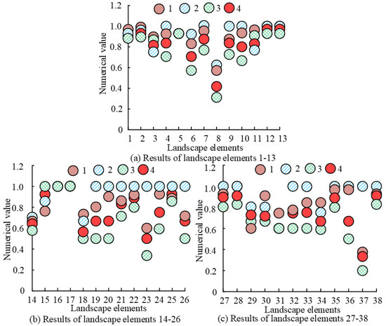 In Figure 8c, Ma, In, and Mi represent macro-, meso-, and micro-scales, respectively. Figure 8 shows that the green visibility values of water landscapes, history and culture, and landscape facilities are concentrated in the range of 0 to 0.2 and show a decreasing trend; the green visibility of aquatic plants is not much different in the range of 0 to 0.6, but when it is more than 0.6, the green visibility decreases significantly. The green visibility values of flower landscapes and amusement facilities are concentrated between 0.6 and 0.9 and between 0.2 and 0.5, and the green visibility values of forest landscapes and road environments are concentrated between 0.4 and 0.7. This shows that the public prefers water body landscapes, historical culture, and landscape facilities with low green visibility; aquatic plant landscapes with medium–low green visibility; road environments with medium–high green visibility; and flower landscapes with high green visibility. At the same time, the public prefers macro-landscapes with low green visibility, meso-landscapes with planted green visibility, and micro-landscapes with very low green visibility and medium–high green visibility.