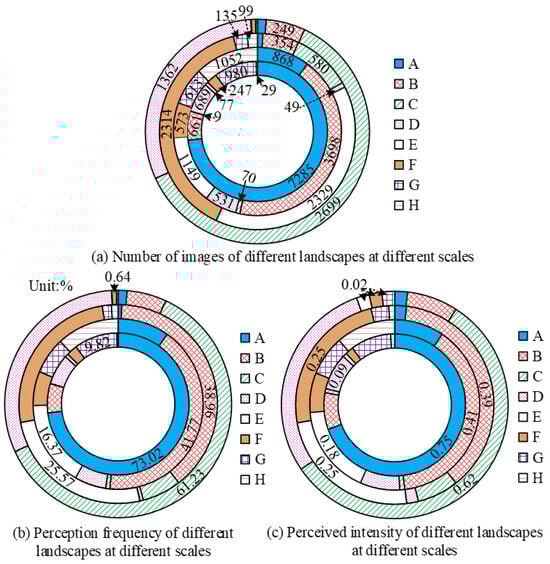 In Figure 5, the four classifications of spatial scales, i.e., macro-, meso-, micro-, and macro-scales, are represented from the inner ring to the outer ring. There are three pillars for the analysis and recording of cities, namely heritage analysis, urban and environmental analysis, and sensory mapping analysis [20]. Comprehensively, Figure 4 shows that in the natural landscape, the perception frequency of water landscape is higher at the macro-scale, at 73.02%; the perception frequency of forest landscape is higher at the meso- and micro-scales, at 41.77% and 38.96%, respectively; and the perception frequency of floral landscape is higher at the macro-scale, at 61.23%. In the humanistic landscape, the perception frequency of amusement facilities is higher at the macro-scale, at 9.82%; the perception frequency of history and culture is higher at the meso- and micro-scales, at 16.37% and 25.57%; and the perception frequency of landscape facilities is higher at the macro-scale, at 0.64%. The values of the perception intensity comparison between macro- and macro-scales are 1.0 and 0.9, respectively. On the whole, the public perception of the natural landscape is significantly higher than that of the humanistic landscape on the macro- and micro-scales, and overall, the spatial perception level of an LP landscape is more preferred by tourists for spatially expansive and far-reaching natural landscapes on large scales and for humanistic landscapes on small scales with refined designs.