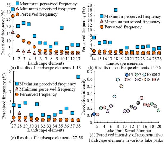 In the perceptual feature analysis of landscape elements, one to nine labels were retained for each image through confidence filtering; thus, 89,089 label data were obtained. In addition, in the perceptual intensity analysis, the five elements that best represented the commonality of LP landscape imagery, namely evergreen trees, lakes, grass, background buildings, and reflections, were excluded, and only the strongest perceptual landscape elements were counted for each park. Therefore, the frequency and intensity of each landscape element are shown in Figure 6.