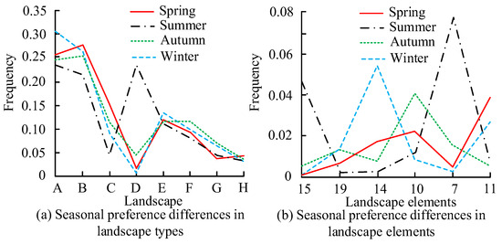 In Figure 6d, values 1 to 20 on the horizontal axis indicate the 20 lakes. Figure 6 shows that the five common elements have the largest values in the perceptual frequency analysis, at 27.40%, 13.21%, 10.02%, 8.65%, and 5.68% [21]. The perceived intensity values of parks 2, 4, and 15 for traditional architecture are the largest, at 0.11, 0.21, and 0.31, respectively. Comprehensively, the public prefers a natural landscape with green trees and blue waves, and the perceptual intensity results show that the landscape qualities of an urban LP fit the current situation of the green environment and are also in line with the actual situation in the study area. Based on this, PPP was further analyzed, and due to space constraints, this study only explored the differences in perceived preferences for landscape components in different seasons. The results depicting seasonal preference differences for various landscape types and elements are presented in Figure 7.