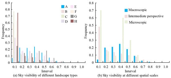 Figure 9 shows that the sky visibility values of water landscapes are mainly concentrated between 0.1 and 0.5; the sky visibility values of forests, flowers, aquatic plants, history and culture, landscape facilities, and the actual road environment are all concentrated between 0 and 0.1. The sky visibility values of amusement facilities are in the ranges of 0–0.1 and 0.3–0.5. The average sky visibility values of macro-, meso-, and micro-landscapes are 0.315, 0.158, and 0.082, respectively. On the whole, the public prefers water body landscapes and amusement facilities with medium-to-high openness and other landscapes with low openness among different landscape types. For different scales of spatial openness, the public prefers macro-scale landscapes with medium–high openness and meso- and micro-scale landscapes with low openness.