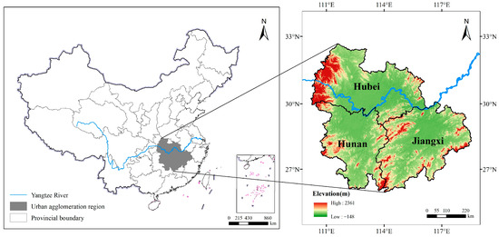 The MRYRUA is the first cross-regional mega city cluster officially recognized by the Chinese government. The MRYRUA is situated in central China, spanning the Hubei, Hunan, and Jiangxi provinces, and is a crucial node linking east and west China and extending over the north and south (Figure 1). The MRYRUA has a subtropical monsoon climate, with high temperatures and rainy summers, as well as mild and humid winters. The annual precipitation ranges from 1000 mm to 1600 mm, and the average annual temperature ranges from 16 °C to 18 °C [38]. The total land area of the region is about 310,000 km2, with the land use types dominated by forest, cultivated land, and water area, accounting for 48.27%, 36.77%, and 7.26% of the total area, respectively [39]. The high temperature and rainy climate and the complex and varied topography have created a spatial pattern of interspersed paddy fields and dryland. At the end of 2019, the resident population of the MRYRUA was 131 million, concentrated in the cities of Wuhan (Hubei province), Changsha (Hunan province), and Nanchang (Jiangxi province).