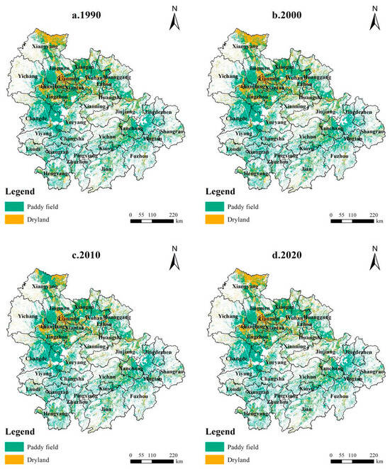 Influenced by natural factors such as topography, rainfall, and temperature and anthropogenic factors such as land policy and population density [60], the spatial distribution of paddy field and dryland in the MRYRUA varies significantly (Figure 2). The area of paddy field has been consistently higher than that of dryland over the past 30 years, with the maximum difference between the two being 55,215.22 km2 in 2010 and the minimum difference being 51,230.20 km2 in 2020. The difference between the area of paddy field and dryland in 1990 and 2000 was 53,334.85 km2 and 53,011.21 km2, respectively. The proportion of paddy field and dryland to the total cultivated land remained in the ranges of 70.44–72.03% and 27.97–29.56%, respectively.