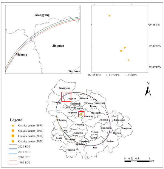 Standard deviation ellipses can measure the directionality and centripetal nature of geographic elements and their trends [45]. The longer the y-axis, the more discretely the data are presented, and conversely, the more centripetal the data are. The higher the ratio of the difference in distance between the two axes, the more obvious the orientation of the data; otherwise, the orientation of the data is not obvious [45].