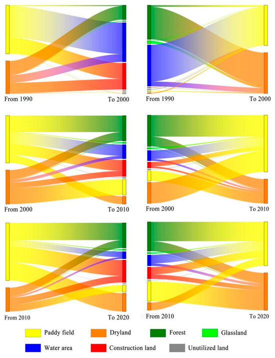 The years 2000 to 2010 were a period of rapid variation in paddy field and dryland areas. A total of 9393.30 km2 of paddy field and 6753.51 km2 of dryland were converted to other land types, of which 34.71% of the paddy fields and 26.33% of the dryland were converted to forest. Under the impact of the Chinese government’s policy of returning cultivated land to forest since the 21st century [66], paddy fields and dryland mainly flowed to forest during this period. In addition, to increase food production and improve farming conditions, the Chinese government has conducted a large-scale “dryland to paddy field” project in the MRYRUA. As a result, a larger portion of the lost dryland and additional paddy fields were interconverted among paddy fields and dryland.