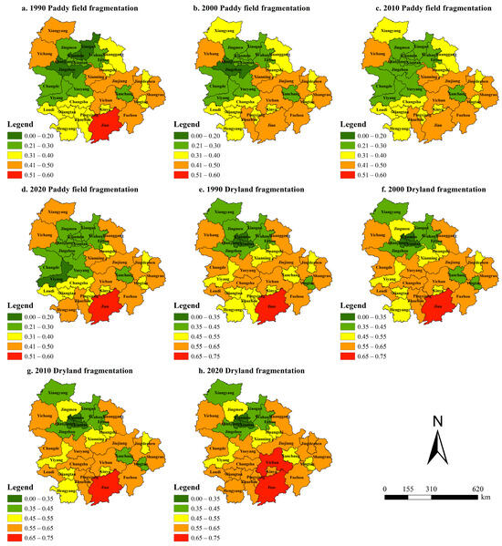 Wheat and corn produced in dryland are the main food crops in most countries around the world, while rice produced in paddy fields is the typical food crop in those countries with large populations in East, South, and Southeast Asia. Few countries in the world have a pattern of interspersed paddy fields and dryland like China. This study analyzes the characteristics of spatiotemporal distribution and fragmentation driving mechanisms of paddy fields and dryland in different periods within the same region, hoping to provide reference for other countries to achieve sustainable agricultural development and increase food production under different cultivated land utilization patterns.