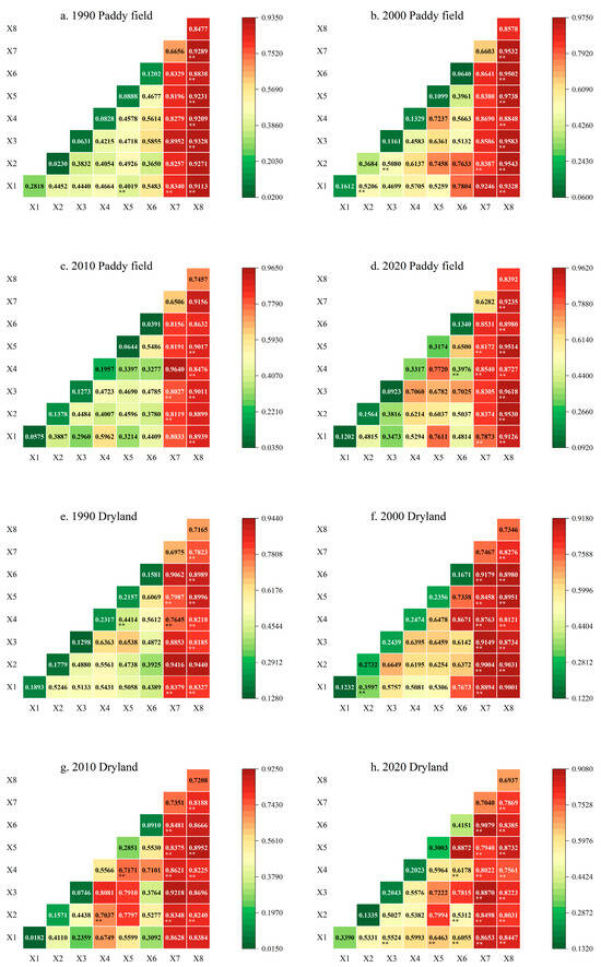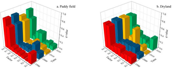 The results of factor detector for socioeconomic factors, agricultural development, and natural conditions on PFF and DLF are shown in Figure 7. Among the socioeconomic factors, the proportion of industry and service industry (X2) and per capita regional GDP (X1) have a higher influence power (q) on PFF, with annual average influence power (q) values of 0.1714 and 0.1552, which are much higher than the value of 0.0997 for urbanization rate (X3). Among the agricultural development factors, the annual average influence power (q) of per capita disposable income of rural residents (X4) on PFF and DLF is 0.1857 and 0.3095, which is a relatively important factor driving spatial-temporal change in PFF and DLF. Among the natural condition factors, slope (X8) and elevation (X7) had consistently high influence power (q) on PFF and DLF. The mean annual influence power (q) values for elevation were 0.6512 and 0.7208, respectively, and for slope were 0.8226 and 0.7164, respectively. The factors of socioeconomic and agricultural development categories are significantly weaker in driving PFF and DLF than the factors of natural conditions. Elevation and slope of cultivated land are the dominant factors driving PFF and DLF in both paddy field and dryland.