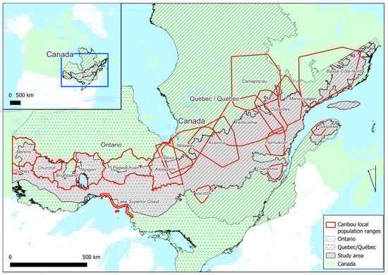 Location of the study area in the Canadian provinces of Ontario and Quebec, and the boreal caribou local population ranges.