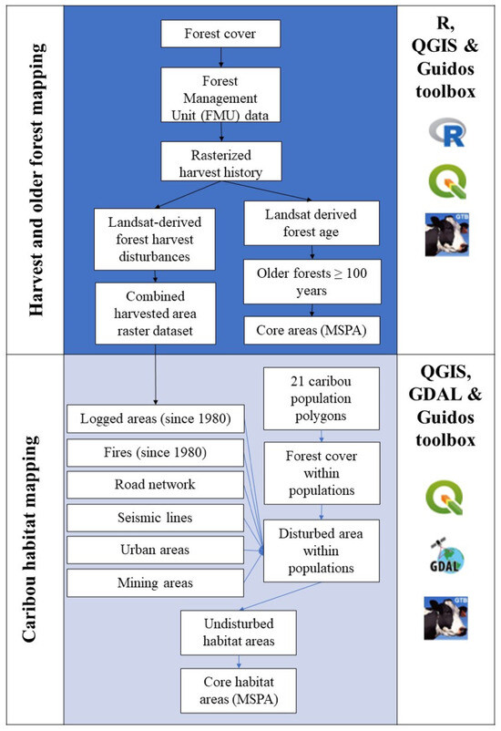 The analytical workflow used in this study is illustrated in Figure 2. First, we delineated the forest area using a modelled land cover characterization spatial data layer for Canada at a 30-m pixel resolution [48,49]. The land cover layer for 2019 was used, selecting only forested pixels (mixed wood, broadleaf, and coniferous). We masked the forest cover layer to the study region and calculated the managed public forest area values. We then compiled data on the forest management history, including the year of logging and forest age, from (i) the two provincial forest management inventory databases where the data are georeferenced to polygons within local forest management units (FMU) and (ii) the national modelled datasets on logging history and forest age (Figure 2). These data were processed using the terra package [50] in R [51] and QGIS [52].