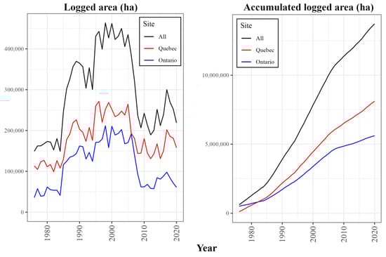 The cumulative area of recently logged forest (from ~1976 to 2020) was 14,024,619 ha, with 8,210,617 ha in Quebec and 5,814,002 ha in Ontario (Table 1, Figure 3 and Figure 4). The annual area logged peaked in the year 2000 at 462,097 ha, with a sharp decline in 2008 coincidental with the global financial crisis (Figure 4). While there was a reduction in the rate of cumulative area logged from 2008, the cumulative area continued to increase monotonically.