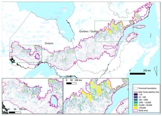 The total area of older forests (≥100 years old) was 21,249,341 ha, with 11,840,474 ha in Quebec and 9,408,867 ha in Ontario (Table 1; Figure 5). Of this, the patch analysis assigned 8,359,381 ha as core area (Table 2). The patch count statistics (Table 3) revealed that there were 1,085,822 core older forest patches <0.25 ha and an additional 603,052 < 1.0 ha. There were 52 > 1000–50,000 ha and 8 > 50,000 ha (Figure 5).