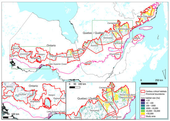 The distribution of core caribou habitat patches within the 21 critical habitat population ranges, coloured by patch size category.