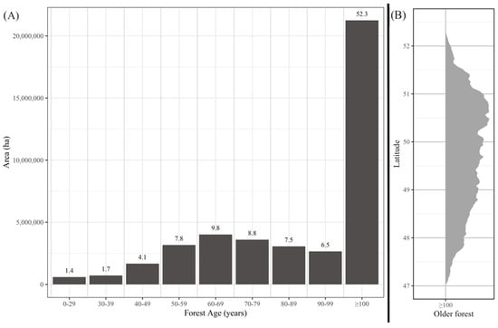 Our main findings (Table 1, Figure 3) reveal a total recently logged area of ~14 M ha that constitutes around 28% of the study area. We use the term “recently logged since ~1976” as the results are limited by the available data sources, and this is an estimate of when reliable provincial forest management information systems and FMU record keeping were implemented. However, it is well established that Eastern Canada has a long history of logging, throughout much of the 19th century [75]. Eastern Quebec, for example, experienced selective logging during the 19th century, with intensification of logging during the first half of the 20th century as clearcutting, plantations, and salvage logging following wildlife or insect outbreaks [76] ramped up only after 1975 [18]. Consequently, it cannot be assumed that forests with no record of recent logging after approximately the early 1900s have never been logged and therefore would meet the formal definition of primary forest [77]. Further analysis revealed that the forests for which there is no record of recent logging (since ~1976) contain a range of age classes, including ~21.2 M ha of older forests. Most of the remaining older forests are found at the northern boundary of the study area, with smaller areas in the south reflecting the long legacy of logging combined with natural disturbances (Figure 7).
