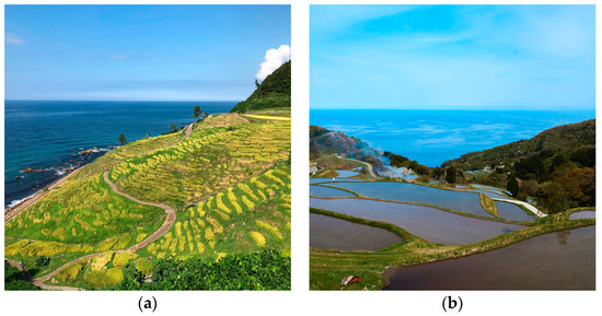 (a) Shiroyone Senmaida Rice Terraces; (b) Iwakubi Shoryu Rice Terraces (source: Wikimedia Commons [33,34]).