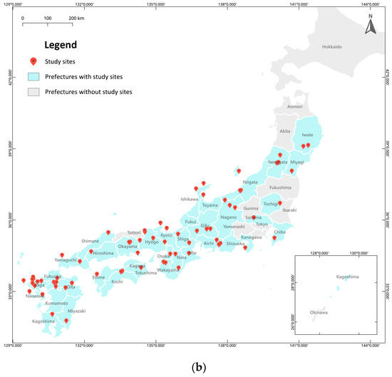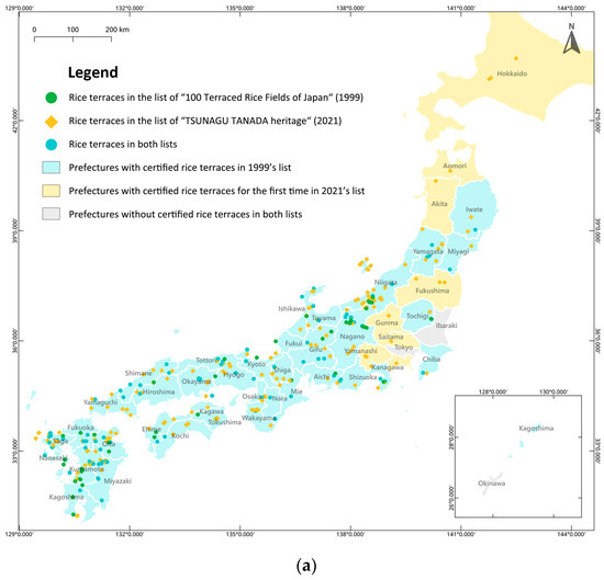 Rice terraces are found throughout the hilly and mountainous terrain in Japan, about two-thirds of which are concentrated in southwest Japan (west of Toyama, Gifu, and Aichi) [31]. The current study focuses on rice terraces certified in two nationwide selections initiated by MAFF in 1999 and 2021 (as mentioned in Section 2.1). As illustrated in Figure 2a, among the 47 prefectures in Japan, the only prefectures that have no certified rice terraces are Tokyo, Ibaraki, and Okinawa.