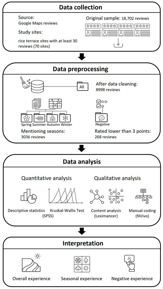 With the speed and ubiquity of social media and mobilities, netnography is gaining acceptance within tourism scholarship as a feasible solution for researching tourism experiences [68,69]. Netnography is a multimethod that leverages the power of content analysis, historical analysis, semiotics, hermeneutics, narrative analysis, and thematic analysis, among others [70,71]. It is faster, simpler, and more cost-effective than traditional ethnography and more naturalistic, objective, and unobtrusive than focus groups or interviews [65,72]. Thus, we conducted a mixed-method content analysis based on netnography, which is capable of revealing tourist-centered perspectives on the rice terrace experience. The research workflow can be divided into four phases: data collection, data preprocessing, data analysis, and interpretation (See Figure 3).