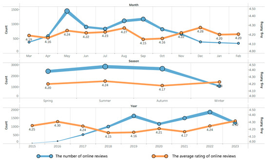 Table 1 summarizes the distribution in the number of reviews by year, month, season, and rating. As shown in Figure 4, the line charts depict the temporal distribution in the reviews and average ratings by month, season, and year.