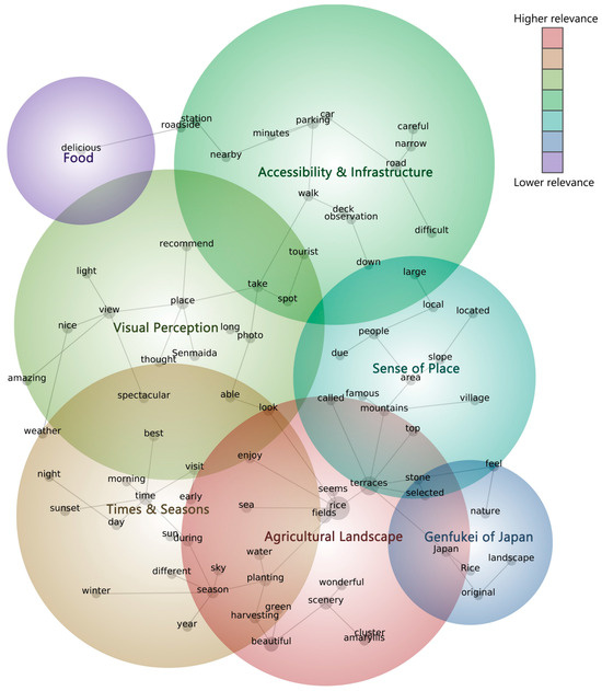 As shown in Figure 5, the seven themes and their hits (the number of text blocks associated with the theme in the project) are (1) Agricultural Landscape (8245), (2) Times and Seasons (5491), (3) Visual Perceptions (5390), (4) Accessibility and Infrastructure (3663), (5) Sense of Place (3052), (6) Genfukei of Japan (1159), and (7) Food (267). To simplify the explanation, we discuss themes 1, 5, and 6, and themes 4 and 7 as two separate groups.