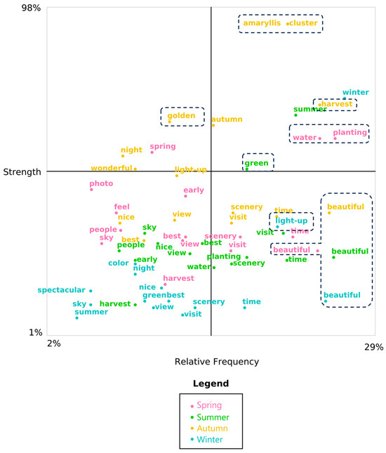 To investigate the different characteristics of the seasonal experiences of rice terraces further, we generated an insight dashboard quadrant report by Leximancer (see Figure 6). As previously mentioned, reviews containing descriptions of seasons were manually labeled and categorized. The quadrant plot divides the relevant concepts (i.e., attributes or independent variables) of four seasons (i.e., categories or dependent variables) into four quadrants by their strength and relative frequency, which are widely used to compare characteristics between different categories of texts [85,86]. The relative frequency axis represents a conditional probability that measures the frequency a concept is mentioned. The strength axis is the reciprocal conditional probability, which gives the probability that a concept comes from a category. Strong concepts help distinguish one season from the other. The intensity and frequency scores are combined using Bayesian statistics to produce prominence scores, which are absolute measures of correlations between concepts and seasonal categories [77]. Table A2 (Appendix A) ranks the most prominent concepts for each seasonal category.