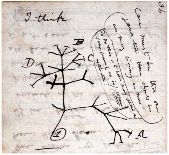 The sketch by Charles Darwin of the so called “Tree of Life” in his Notebook B “Transmutation of Species” (1837), p. 36. It shows the different paths of the national evolution, but also the different possibilities of evolution of a phenomenon in its own dynamic changing. (Public domain).