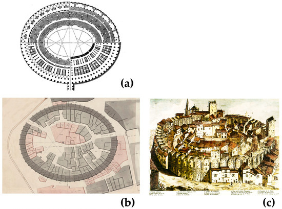 If self-contained fortified medieval villages were built on the amphitheaters of Nimes and Arles (Figure 3b,c, now disappeared due to nineteenth-century “cleanings”), in other situations the same urban element lends itself to different fates.