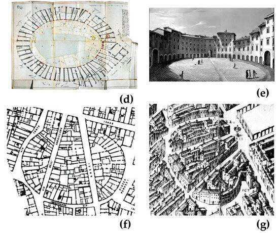 In Lucca (Figure 3d,e), the amphitheater gave rise to an elliptical square, also always maintaining a more or less large space in place of the arena in transition periods, before 1830–1834, in which the figure of the ellipse was still not so clear. In Florence (Figure 3f,g) the amphitheater has been absorbed by the urban fabric and even crossed by two streets such as Via dell’Anguillara and Borgo dei Greci, which, however, have not managed to completely erase the original imprint of the Roman structure, on the contrary the elliptical shape of the original type is still evident.