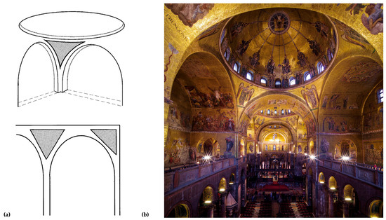 “A pendentive (or three-dimensional spandrel) formed as a necessary triangular space where a round dome meets two rounded arches at right angles (upper). ‘Classical’ two-dimensional spandrels; the necessity triangular spaces between rounded arches and the rectangular frame of surrounding walls and ceilings (lower)”, drawing re-drawn from [31] (a). The interior space of San Marco in Venice with the Byzantine vault and its spandrels, co-protagonist of the figurative program (picture by the Author) (b).