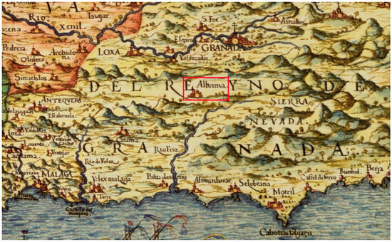 The cartographer and military engineer Pedro Texeira placed Alhama on his 1634 map [23] among the most important cities belonging to the Kingdom of Granada, Figure 3. In the 1696 map of the Italian geographer Giacomo Cantelli [24], Alhama appears at the feet of the Marchán River, which runs parallel to the Cacín River, until it flows into the Genil River, Figure 4a. The ecclesiastical map, drawn in 1712 by Panicale and Montecalerio [25] of the province of Andalusia, included the cities where there were houses and convents of the Capuchin Franciscans, among them, Alhama, Figure 4b.