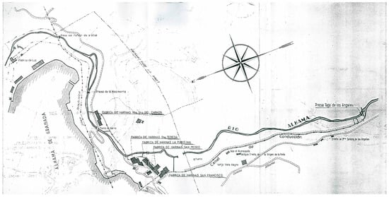 Industrial use of water from the Alhama River. Location of the mills (old flour factories), the Alhama River, and the Caz del Molino irrigation ditch. Plan of the bottom of the Tajos from the Los Ángeles Dam to the end of them in Alhama de Granada. https://www.fcalapurisima.com/p/el-agua-su-uso-industrial.html (accessed on 6 December 2022).