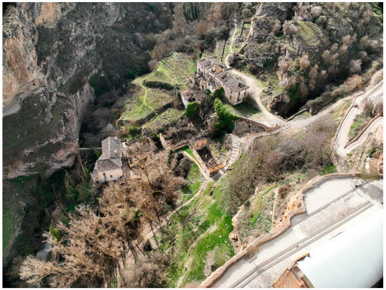 The importance of the Tajos de Alhama is recognized at the level of protection and cataloging with different categories of protection: Asset of Cultural Interest linked to the Historical Complex of Alhama [13], Natural Monument of Andalusia [14], Picturesque Site [15], and Outstanding Landscape [16]. However, all these recognitions and inscriptions in National and Andalusian Heritage catalogs have not prevented the progressive state of degradation of its hydraulic flour mills and its closest surroundings, within the Tajos.
