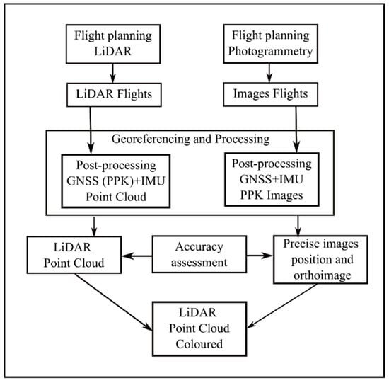 To correctly identify the objects and structures in our scenario, it is very useful to have the colored point cloud. The Velodyne LiDAR alone does not produce such a cloud and to achieve it, additional photogrammetric flights have been carried out to color the complete LiDAR point cloud. The method used to obtain the colored point cloud is shown in Figure 10: