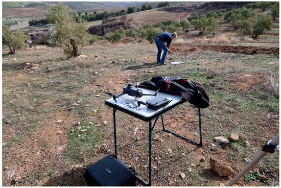 To achieve georeferencing in the aforementioned reference system, the GNSS data were post-processed using PPK (post-processed kinematic) calculations. For this purpose, a GNSS base stationed in the vicinity of the flight areas were used to record GNSS data during the entire flight time. The coordinates of this station were computed using the RAP (Andalusian positioning network) as reference stations.