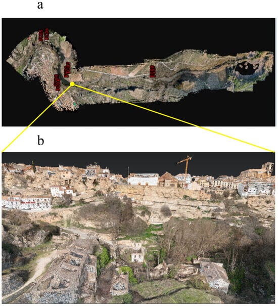 To make correct interpretations of the landscape elements, it was necessary to color the whole point cloud shown in Figure 19a. The average resolution produced by the point cloud density can be seen in Figure 19b, where a partial perspective from the surroundings of the flour mills located in the natural area of the Tajos de Alhama de Granada is shown. That perspective shows the trees that motivated the decision to carry out the survey by LiDAR rather than photogrammetry.