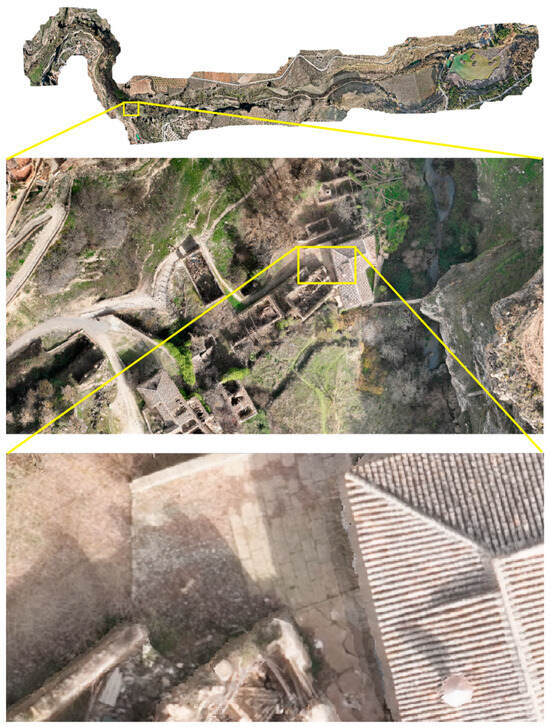The georeferencing root mean square error of this photogrammetric processing was 0.121 m. Taking advantage of the photogrammetric block structure, the orthophotography was extracted to facilitate the interpretation of objects not well identified in the point cloud. The orthophoto and a detail of it can be seen in Figure 21.