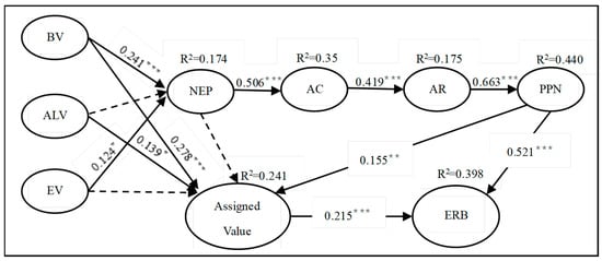 The results of the structural model analysis are shown in Figure 2. The model explained 39.8% of the total change in the ERB of residents in national park communities. PPN are the most important factor influencing residents’ environmental behavior, with a path coefficient of 0.521 (t = 12.808, p = 0.000). The AV also had a significant positive impact on residents’ ERB, with a path coefficient of 0.215 (t = 4.711, p = 0.000). At the same time, PPN indirectly affected the intention of ERB by AV, with a path coefficient of 0.155 (t = 3.118, p = 0.002). BV and ALV had significant positive effects on AV, with a path coefficient of 0.278 (t = 4.119, p = 0.000) and 0.139 (t = 2.482, p = 0.013), while EV had no significant effect on AV (β = 0.030, t = 0.538, p = 0.539). Contrary to the hypothesis, the NEP also had no significant effect on the AV (β = 0.044, t = 0.755, p = 0.451). Within the framework of the VBN model, BV and EV had significant positive effects on the NEP, with a path coefficient of 0.241 (t = 4.119, p = 0.000) and 0.124 (t = 2.42, p = 0.026), while ALV had no significant effect on the NEP (β = 0.045, t = 1.270, p = 0.205). The NEP has a significant positive effect on AC, with a path coefficient of 0.506 (t = 10.48, p = 0.000). AC had a significant positive effect on AR, with a path coefficient of 0.419 (t = 9.367, p = 0.000). AR had a significant positive effect on PPN, with a path coefficient of 0.663 (t = 16.966, p = 0.000). Therefore, all hypotheses were supported by survey data except those of H1b, H6c, and H7.