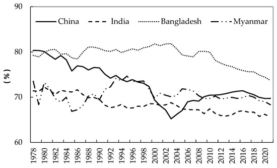 Proportion of planting area of grain crops to total planting area of agricultural crops in China, India, Bangladesh, and Myanmar during 1978–2021.