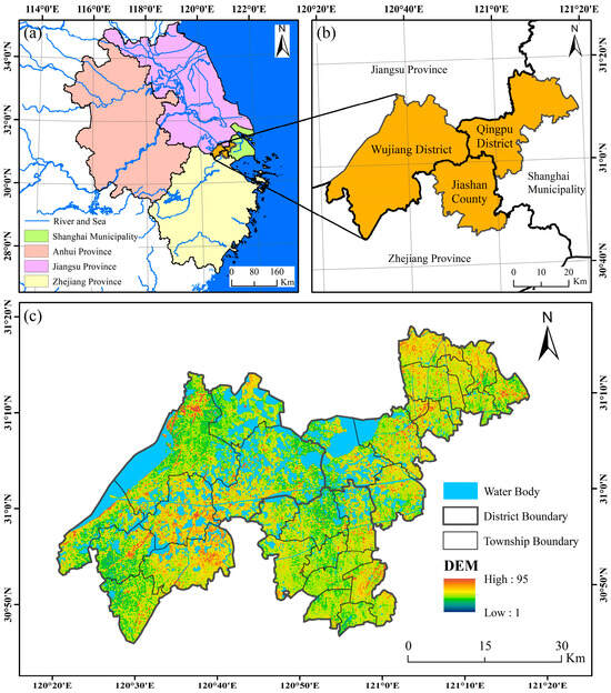 A general view and the location of the DZGIED. (a): YRD’s river system and DZGIED’s location in YRD; (b): District administrative divisions in DZGIED; (c): Elevation of DZGIED.