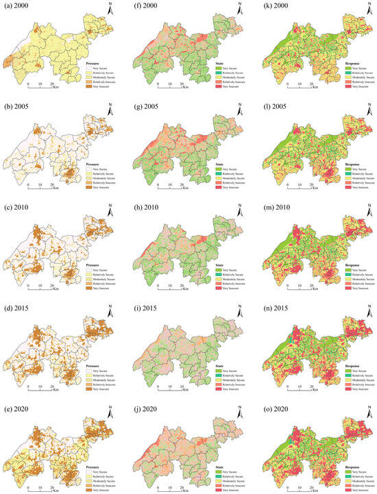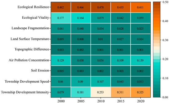 After a series of calculations, the index weights were obtained, see Figure 2. In the pressure layer, the air pollution concentration was most weighted in 2000, and the topographic difference was negligible. But by 2020, the weight of township development intensity is the highest because the DZGIED is in the plain, and the impact of the topographic difference on ecological security is almost zero. In the state layer, in 2000, the effect of ecological vitality is most significant, and the land surface temperature is less weighted. While in 2020, the weighting values of the land surface temperature and landscape fragmentation remarkably increased. In the response layer, compared to 2000, in 2020, the value of the ecological resilience weighting has decreased slightly, but the degree of influence has always been more significant. It can be deduced that township development intensity, air pollution concentration, and ecological resilience are the key indicators affecting the level of ecological security in the DZGIED.