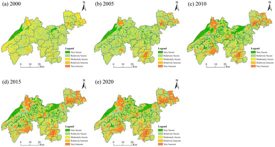 See Figure 9 for details. In 2005, the pressure on the ecosystem first increased and then showed a trend of continuous decline, which is consistent with the time change trend of the overall ecological security. According to this index, the overall pressure on the ecosystem in the DZGIED is increasing. From the perspective of the security level of the demonstration zone, only Qidu Town, Songling Town, and Zhujiajiao Town maintain the safety level, showing a relatively stable state. The safety level of Qingpu District’s clusters of towns in the Wujiang Development Zone is declining yearly. According to the index of the pressure layer, township development intensity and air pollution concentration have a more significant negative impact on ecological security pressure. Compared with that in 2000, the development intensity’s effect on the demonstration zone’s environmental security pressure was significantly more significant in 2020. The development intensity and pollution of the industrial park are more severe than in other regions, which will cause more pressure on the ecological security in the demonstration zone.