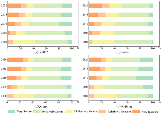 The total area of the different security levels in the DZGIED, Jiashan County, Qingpu District, and Wujiang District was calculated, see Figure 4. The proportion of zones at the unsafe level increases year by year, the ratio of areas at the less safe level more or less remains the same, the balance of zones at the critical safe level decreases year by year, the proportion of regions at the safer level increases and then falls year by year, and the ratio of areas at the safe level also decreases year by year from 2010 onward. In 2005, the proportion of areas in a good state increased by 10% compared to 2000, and the overall ecological safety level was also the highest in 2005. By 2020, the proportion of areas below the second level increased to 29.48%, but the proportion of areas at a good ecological safety level still had the highest percentage. From 2000 to 2020, the proportion of areas in a good state (the fourth level) of ecological safety was higher than in any other state, and the proportion of areas in a safe state was increasing, indicating that the overall ecological safety within the demonstration area is in a good state.