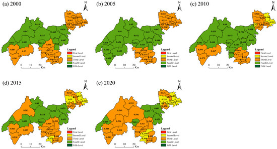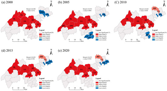 Firstly, the global Moran’s I index was calculated. Global spatial autocorrelation was performed for each year. The 2000 global Moran’s I was 0.398, the 2005 global Moran’s I was 0.551, the 2010 global Moran’s I was 0.462, the 2015 global Moran’s I was 0.495, and the 2020 global Moran’s I was 0.471. The values of the Moran index in these five years are all in the [0, 1] range, indicating a positive spatial correlation in the ecological security in the demonstration zone in the past 20 years, and the spatial autocorrelation is strong. In particular, in 2005, 23 townships showed a positive spatial autocorrelation, accounting for 82.14% of the entire study area. One of the townships with a positive correlation was fewer in 2020 than in 2005. The results showed that the cities with positive spatial correlations decreased in number slightly but remained essentially unchanged.
