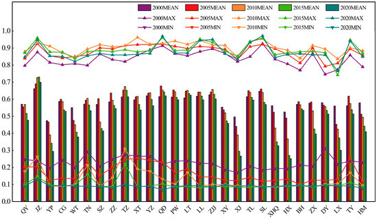 The average value of the RES for each township in the DZGIED was noted and expressed in levels (see Figure 5), and the maximum and minimum values of the RES for each township were counted separately (see Figure 6). It can be seen that the mean RES decreases from 0.601 in 2000 to 0.533 in 2020, and the security level decreases from the fourth level to the third level, with little overall change, but the ecological security status of each administrative region varies significantly spatially, and the RES of each township shows fluctuating changes over two decades. In 2000, most towns were at the fourth level of ecological security. In 2020, the ecological security level in the middle towns turned to the third level, and the levels of some towns in the northeast significantly decreased. Spatially, the ecological security shows a general trend of a slight decline from the northeast and southeast to the center.