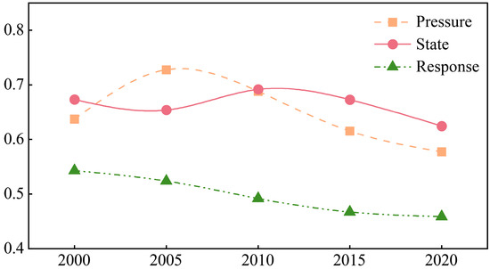 The average value of the RES under different subsystems was calculated separately (Table 3). The environmental pressure in the DZGIED first showed a rising trend and then a decreasing trend (Figure 8). The ecological state showed a trend of declining first and then rising before decreasing again. The value of the ecological response in the DZGIED decreased continuously.