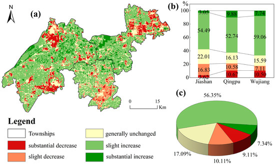 (a) Emerging trends in RES values within the demonstration zone. (b) The proportion of the region in respect of each trend in Jiashan County, Qingpu District, and Wujiang District. (c) The proportion of the area linked to each trend within the demonstration zone.