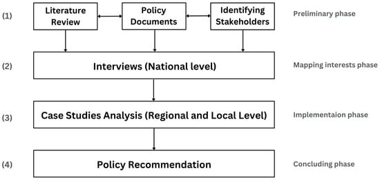 This research aims to clarify the gap between the classic definition of ecological corridors in the literature and their practical implementation, particularly in congested areas. Our investigation proceeds in four parts (see Figure 2). We start by providing a comprehensive literature review on the regulation and management of ecological corridors, discussing key policy documents and setting the background for our subsequent interviews. The policy documents aid in identifying stakeholders at the national, regional, and local levels. This sets the foundation for the second part, conducting interviews with stakeholders at the national and district levels, to map out the key interests impacting the conservation of ecological corridors. This part informs the first objective, elucidating the existing regulatory framework and pointing out major regulatory gaps. The interviews are essential, as they provide direct insights from those responsible for implementing and enforcing regulations, offering a nuanced understanding of the challenges and priorities at each level of governance.