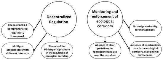 Our review of Israel’s existing regulatory framework, based on policy analysis and stakeholder interviews, reveals gaps in ensuring the long-term preservation of ecological corridors. This review highlights two main regulatory clusters with significant implications. The first cluster is decentralized regulation, characterized by fragmented policies on ecological corridors, involving multiple authorities without comprehensive legal oversight. The second cluster involves enforcement and monitoring issues in ecological corridor management. This stems from the fact that responsibility for managing ecological corridors is either unassigned or dispersed among multiple entities (Figure 3).