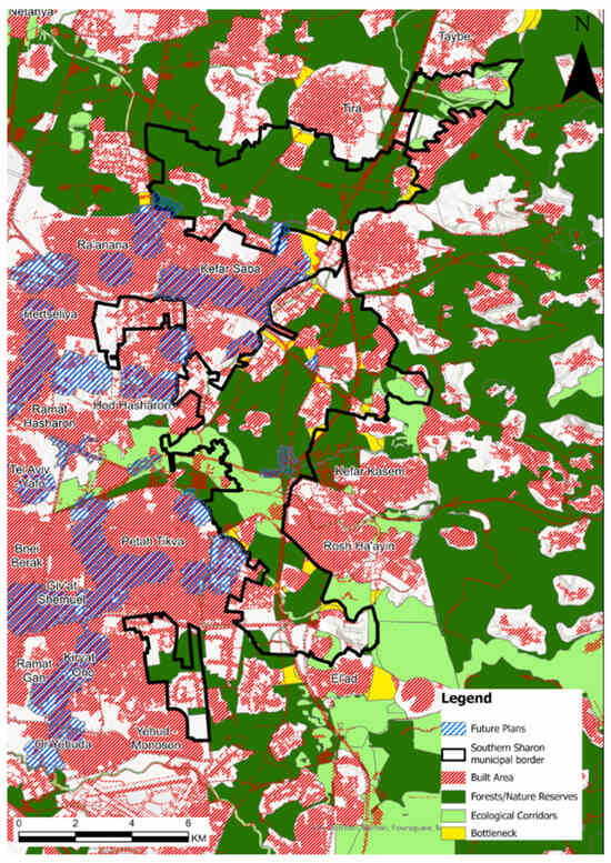 Our study focuses on Israel, particularly its Central District, which is facing rapid construction and increasing population density. The two case studies we examine highlight the challenges of density and reveal further bottlenecks in this already congested region. The first case study, South Sharon Regional Council, spans a significant portion of the Central District and is regarded as a semi-urban area. The South Sharon Regional Council has seen an increase in population growth rate. Between 1983 and 2003, the growth rate in the council was 5.3%. The surge in population is a result of the influx of non-agricultural residents, evident on multiple fronts: the establishment and advancement of communal settlements, initially not engaged in farming (with a growth rate of approximately 6.5% in 2013–2014); the expansion of existing settlements, including kibbutzim (3%) and rural settlements (2.8%), to accommodate “urban” populations not reliant on agricultural livelihoods; and the conversion of agricultural production units into residential units, coupled with the creation of green areas that may serve as auxiliary farms in terms of household income [41]. The second case, the city of Ness Ziona, is more limited in its scale. Over the past few years, Ness Ziona has experienced an annual population growth of approximately 1700 residents. Despite being a green and spacious city, with a population density of less than two inhabitants per dunam, there are numerous land reserves within the city earmarked for construction and development. Examining these two case studies will offer insights into the challenges of regulating ecological corridors at different scales, shedding light on how diverse demands affect planning in an increasingly congested area.
