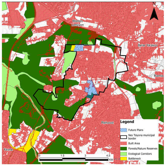 The second case study focuses on Ness Ziona, a small city located 30 km south of Tel Aviv, known for its extensive open areas of calcareous sandstone hills. Ness Ziona’s calcareous sandstone hills are vital for the north–south ecological corridor, supporting national conservation objectives [52]. Ness Ziona’s master plan enables long-term planning (see Figure 5), featuring urban renewal, new residential areas, improved open space connectivity through a bypass promenade, and a scenic easement within the ecological corridor. This appendix categorizes areas by ecological importance, aiding sensitive development planning. The plan also designates 15% of the area for open spaces, supporting urban development near existing areas. These initiatives by the local authority may help to overcome the regulatory gaps, mainly the absence of a construction ban in critical areas and efficient management of the critical areas of the corridor.