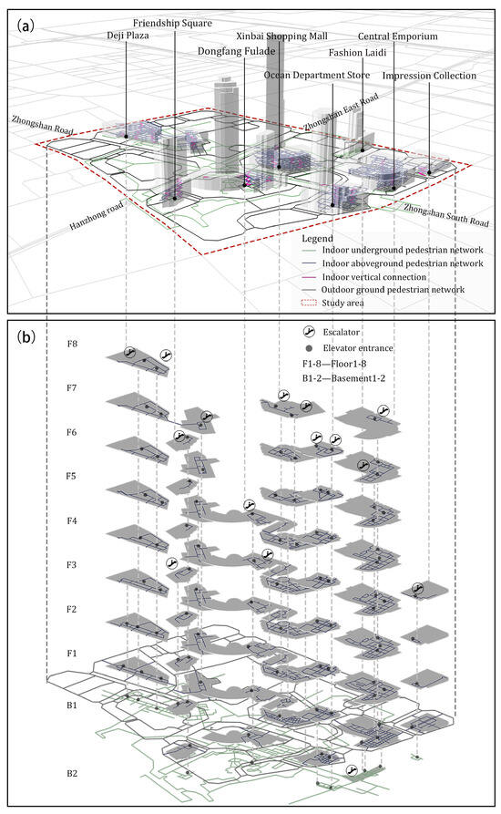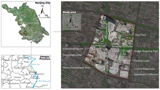 Xinjiekou is located in the central district of Nanjing, Jiangsu Province (Figure 1), and is renowned as one of China’s most famous commercial centers, with a history spanning over a century. Known as the “Number One Commercial Circle in China”, this area hosts more than 700 stores, with approximately 30 large and medium-sized enterprises each occupying over 10,000 square meters of space, showcasing a notable trend toward three-dimensional development. Xinjiekou is not only the core of Nanjing’s above-ground commercial activities but also one of the most concentrated areas for underground space development. As the largest metro transfer station in Asia, Xinjiekou Station connects more than ten major commercial complexes, forming a closely interconnected commercial service network that spans both above-ground and underground spaces. This unique urban morphology facilitates efficient pedestrian flow and seamless movement between different levels, fostering a highly integrated environment for shopping, dining, and entertainment. This diverse range of activities attracts a large number of local residents as well as domestic and international tourists, making Xinjiekou a key driver of Nanjing’s thriving service industry. Therefore, the complex three-dimensional pedestrian network and dense commercial service layout of Xinjiekou make it an ideal subject for this study.